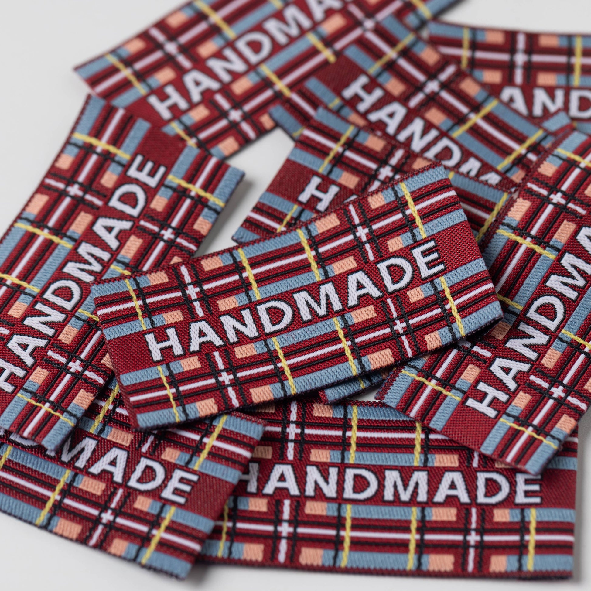 Add the perfect finishing touch to your autumn-winter creations with our Highland Handmade woven labels. Featuring 'Handmade' in snowy white on a rich, autumnal tartan, this label is both stylish and seasonal. Tartan is a quintessential autumnal pattern that returns year on year.