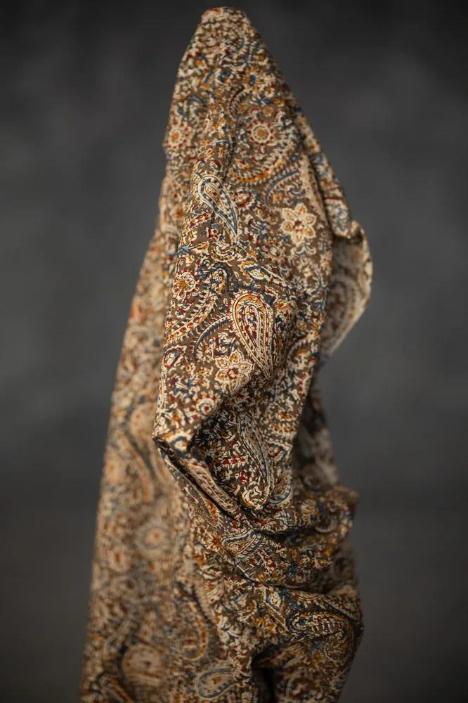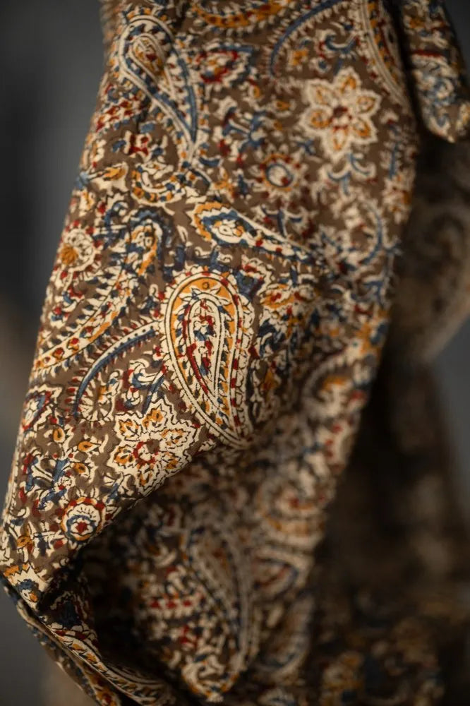 A traditional Indian block print from Bagru in khaki green, red, blue and mustard. Bagru, a small village in Rajasthan, 35 kilometres from Jaipur, is known for its hand block printing utilising traditional processes and natural colours. Bagru prints tend to be more simple with limited colours in comparison to Sanganer block prints which are more colourful with finer detail. Block printing is still practiced by the Chippa community, who have lived here for over 400 years.